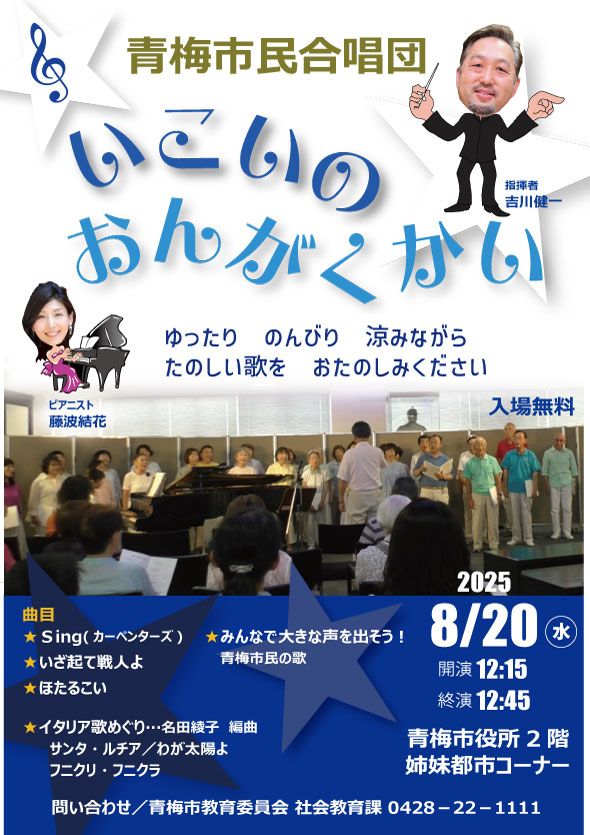 ※ なお、翌日8月21日(木)も同じ時間、同じ場所で、同じく掌理団体の「青梅児童合唱団」さんが演奏なさいます。