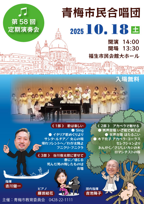 「ファミリーコンサート」は、東京都青梅市の掌理団体である、青梅市青少年吹奏楽団と青梅児童合唱団、そして青梅市民合唱団の3団体が年に一度、一堂に会しての演奏会です。