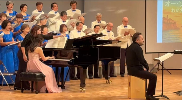 新しい試みで、舞台の横にスクリーンを設置。歌のタイトルや歌詞などもお知らせしながら進めています。途中の演奏では楽器「カホン」も登場。第3部では、詩の朗読もあり。カホンの演奏と朗読、スクリーンの操作もすべて吉川健一指揮者がご担当くださいました。