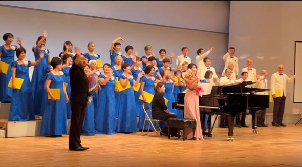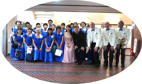 閉演し、ロビーにてお客様のお見送りです。そのあと、その場にいた団員と指揮者の吉川先生、ピアニストの藤波先生もご一緒にパチリ。