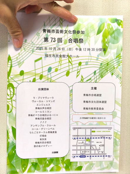 さて、お次は、青梅市合唱祭。このあと約1週間後(10/26/日/福生市民会館/開演:12:30)です。定演の翌日(10/19・日)しか練習時間はとれません。頑張ろう!です。