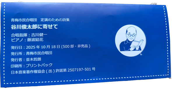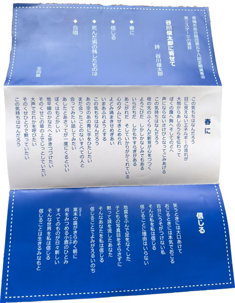 定演ではプログラムの他に、詩集「谷川俊太郎に寄せて」と題したA4版を3つ折りにした小さな詩集も配布。第三ステージの曲の詩を、文字でもお客様にお届けしたいとの思いからです。印刷に際しましては、日本音楽著作権協会様からの許諾をいただくことができました。初めての手続きで心配しましたが、とても迅速にお返事があり、お届けすることができました。